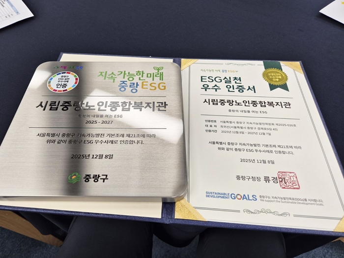 2025 중랑 ESG 우수사례 시상식에서 우리 복지관은 '중랑구 ESG실천 우수사례 인증' 현판과 ESG실천 우수 인증서를 수여 받았습니다.